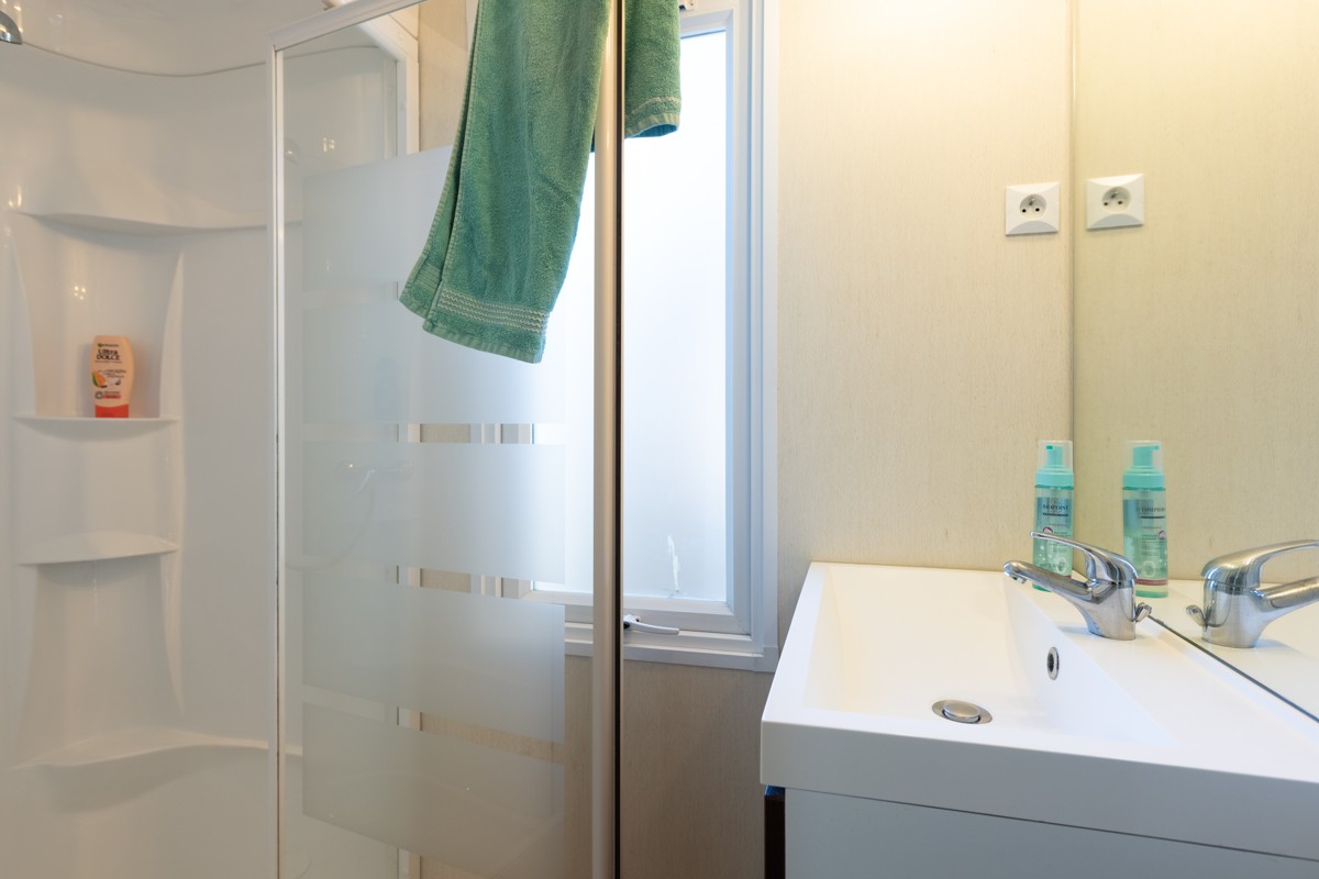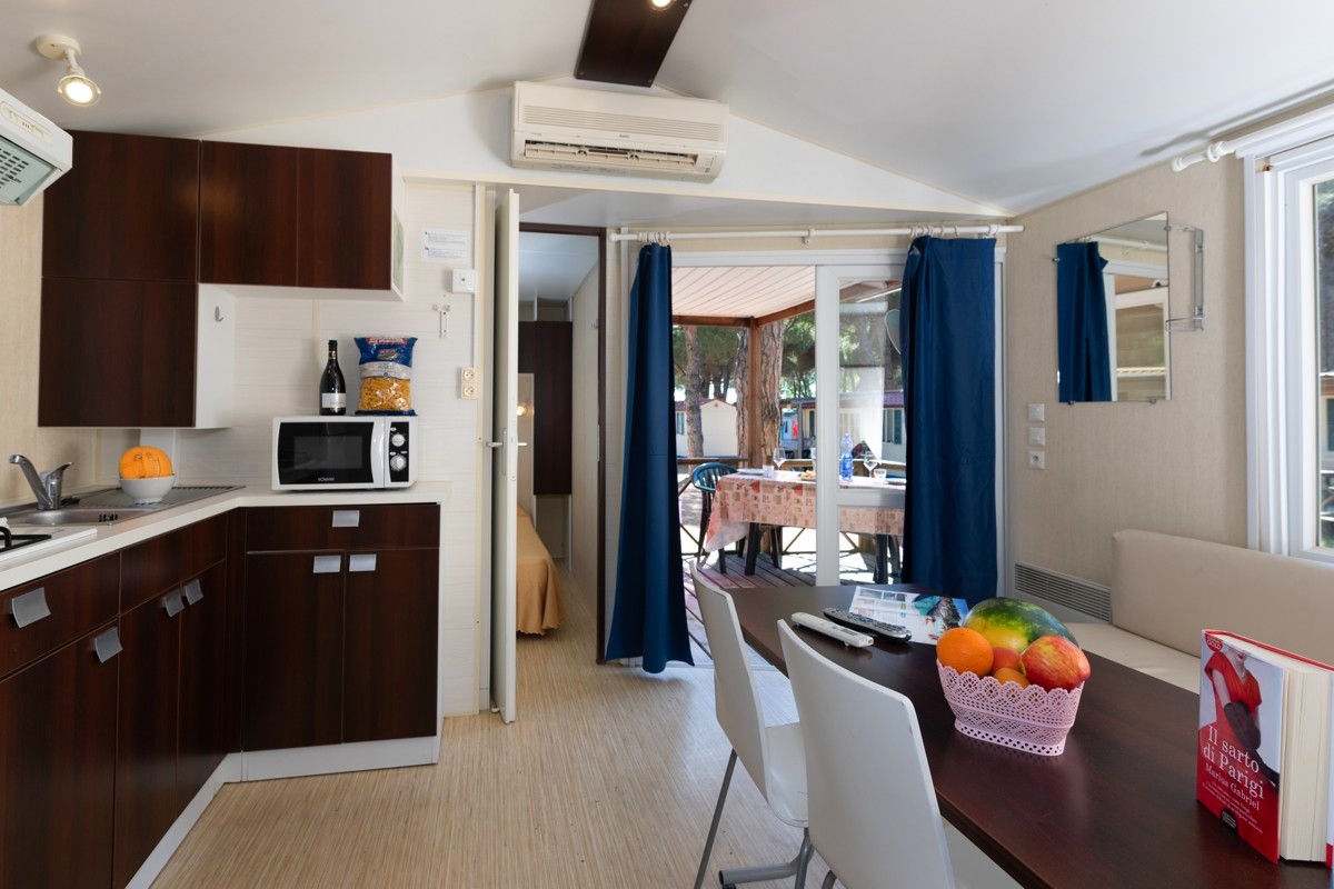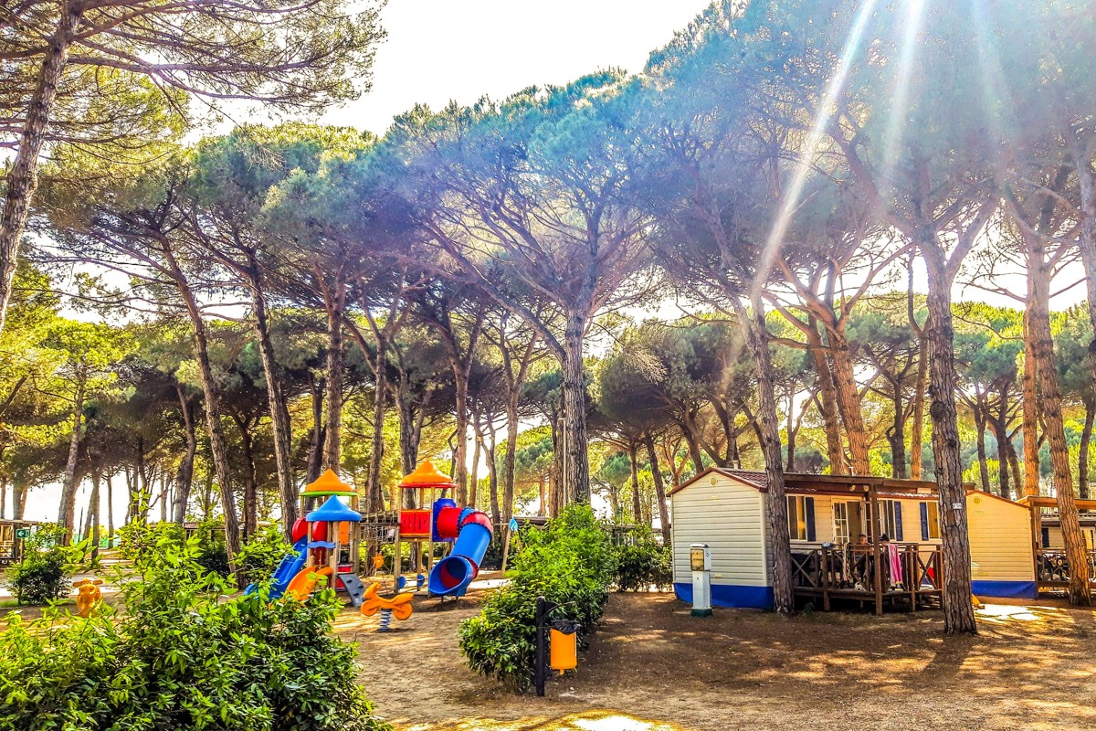 MOBILNÍ DOMY COTTAGE S VLASTNÍ KOUPELNOU A WC JSOU UMÍSTĚNY V SAMOSTATNÉ ČÁSTI KEMPU V PŘÍRODNÍM PROSTŘEDÍ VE STÍNU POD BOROVICEMI
